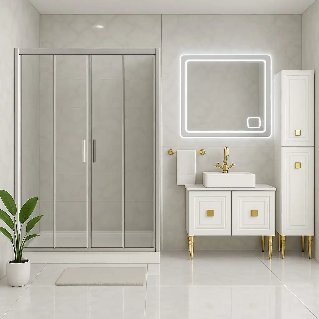 - Kapı Tipi ve Mekanizma: Sürgülü kapılar küçük banyolar için alan tasarrufu sağlarken idealdir. Menteşeli kapılar geniş bir giriş alanı sunar ve daha ferah bir his verir. Katlanır kapılar ise hem alan tasarrufu hem de geniş giriş esnekliği sunar. Rulmanların ve menteşelerin kalitesi, kapıların kullanım ömrünü ve sorunsuzluğunu doğrudan etkiler.